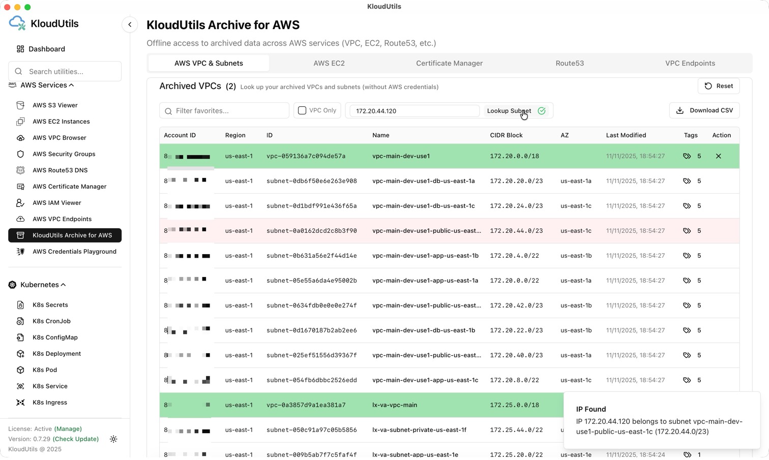 - • KloudUtils Archive for AWS: Offline to access archived data across AWS services (VPC, EC2, Route53, etc.)