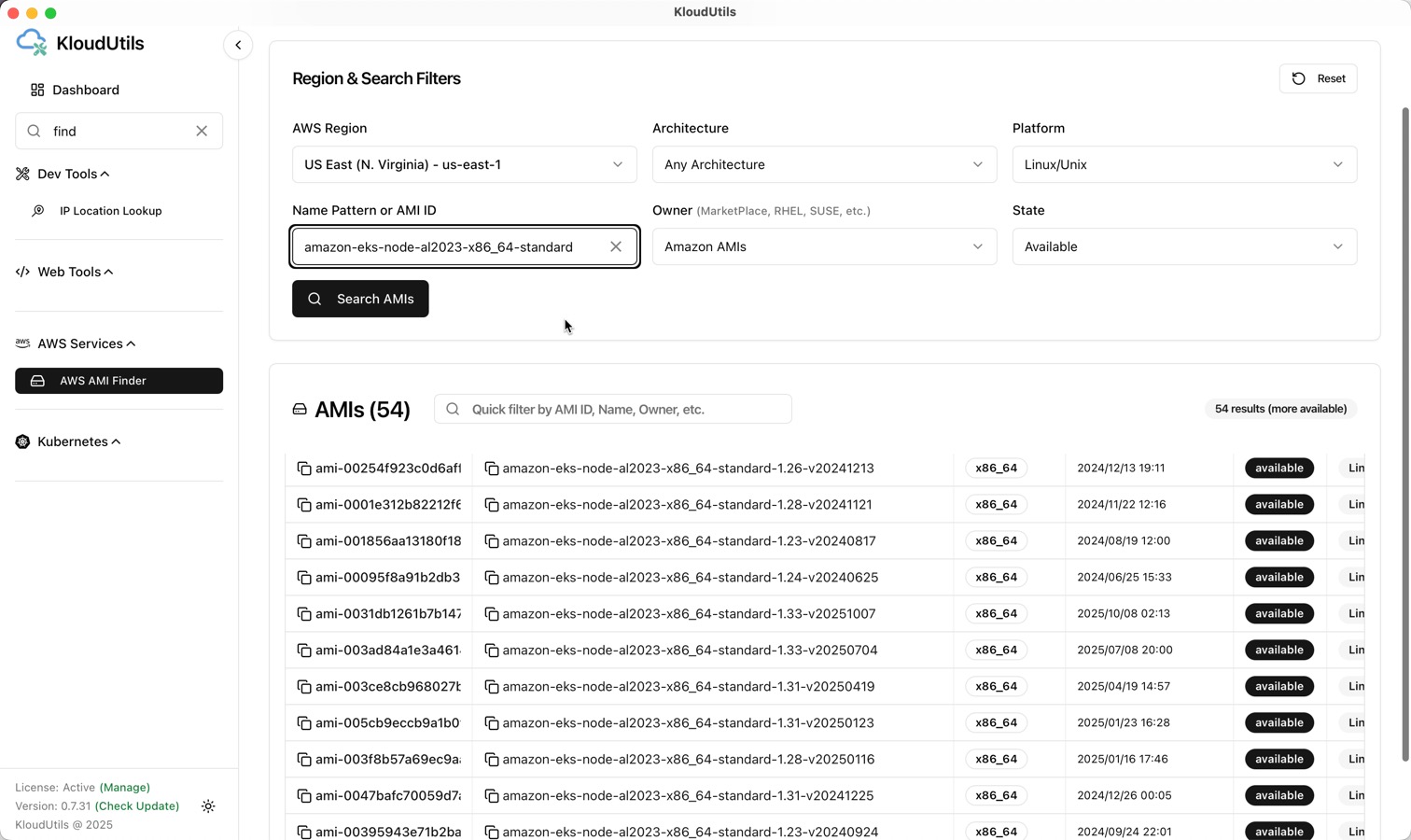 - • Added AWS AMI Finder tool (search by name, ami-id, architecture, platform, etc.)