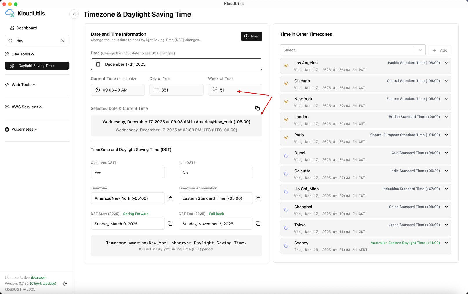 - • Updated Day Light Saving feature with adding Day of Week, Week of Year and UTC time for comparison