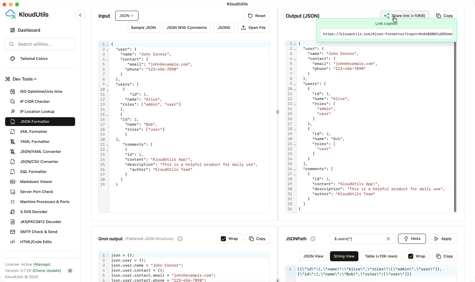 - • JSON Formatter: Format, validate, filter JSON with JSONPath