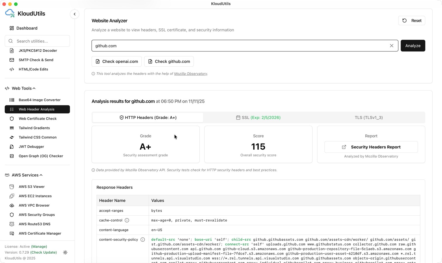 - • Web Header Analysis: Analyze HTTP headers, SSL/TLS